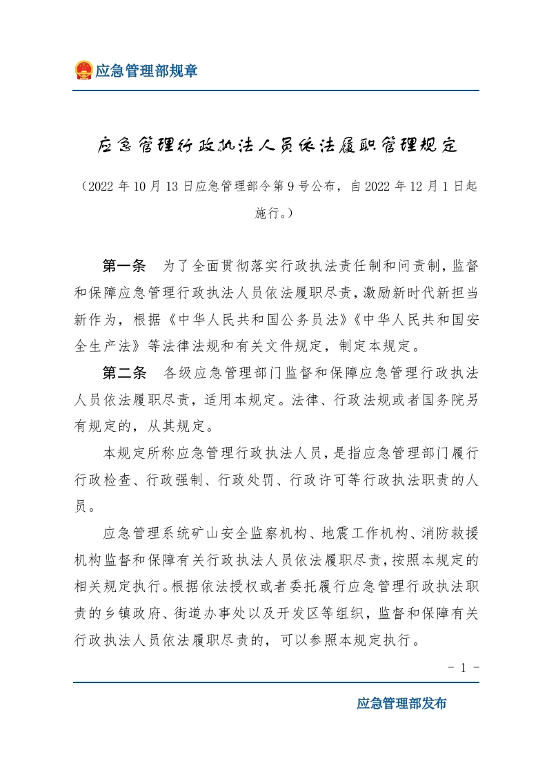 9号令 应急管理行政执法人员依法履职管理规定