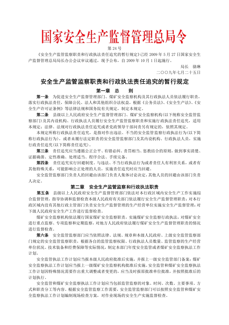 安监总局令[2009]第24号_安全生产监管监察职责和行政执法责任追究的暂行规定(安监总局令[2013]第63号修改)