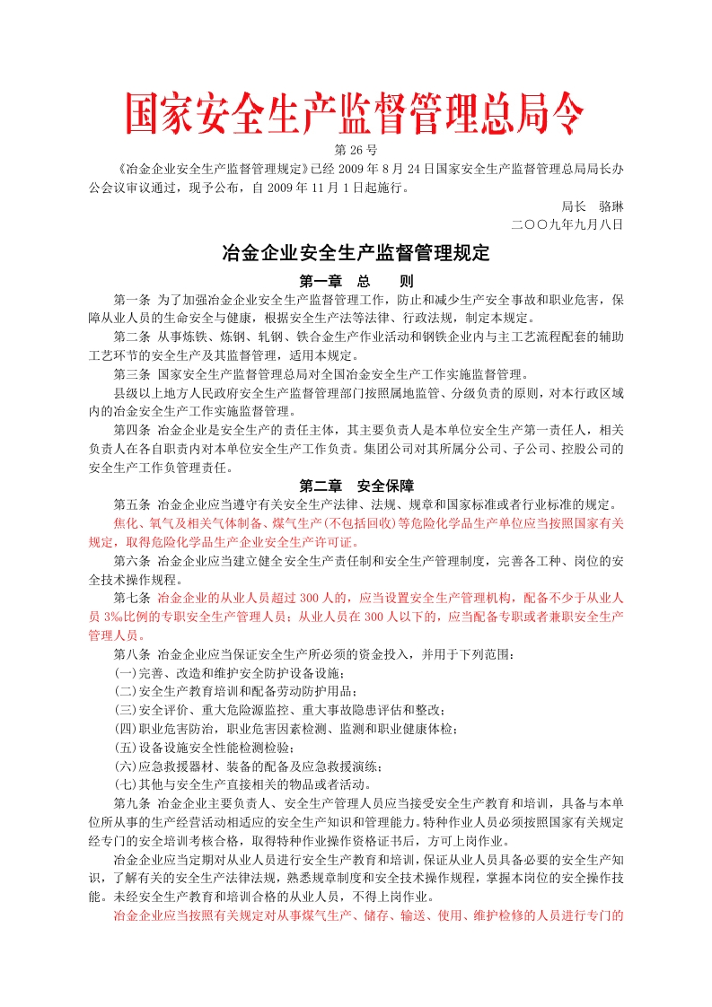 安监总局令[2009]第26号_冶金企业安全生产监督管理规定