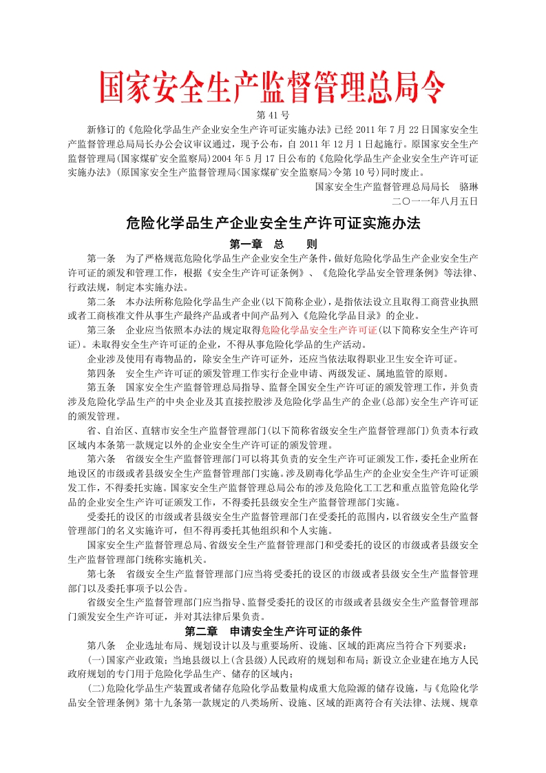 安监总局令[2011]第41号_危险化学品生产企业安全生产许可证实施办法
