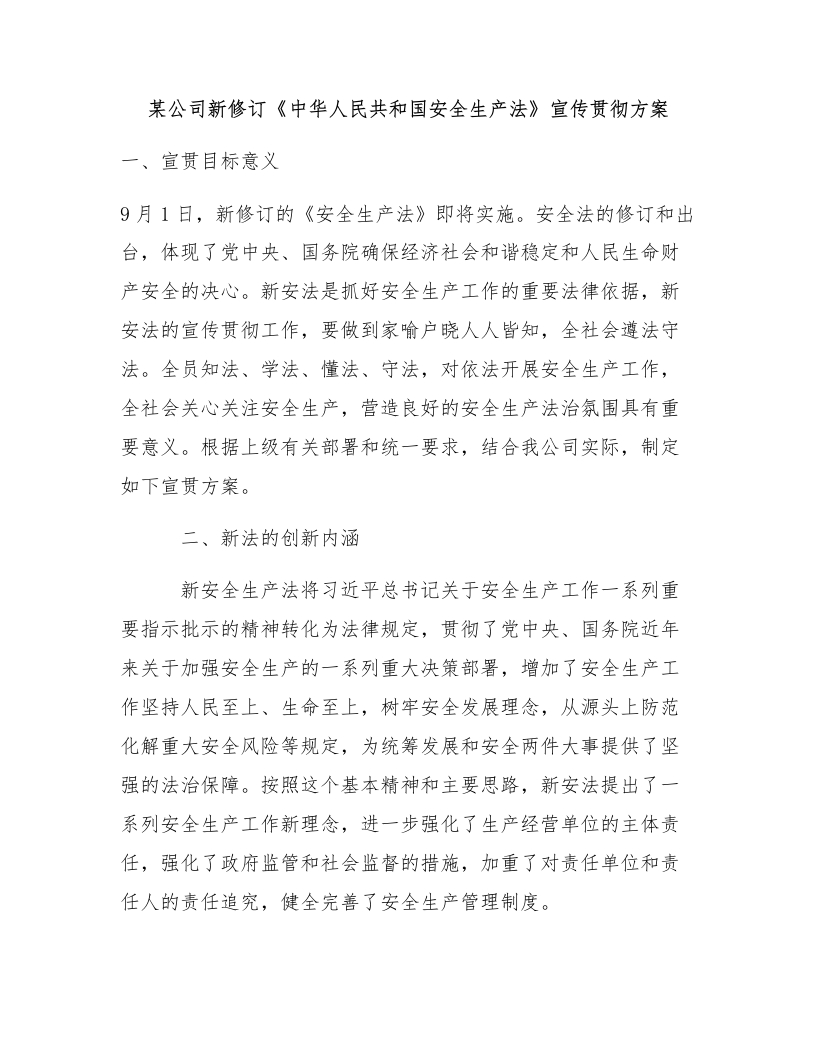 某公司新修订《中华人民共和国安全生产法》宣传贯彻方案