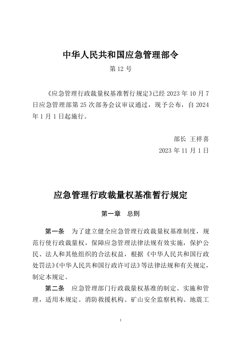 12号令 应急管理行政裁量权基准暂行规定