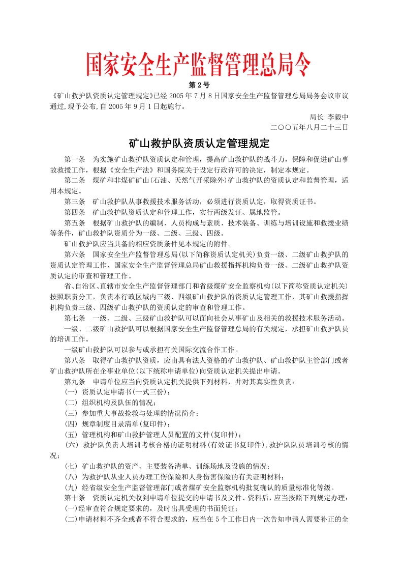 安监总局令[2005]第2号_矿山救护队资质认定管理规定