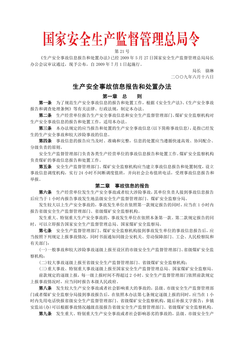 安监总局令[2009]第21号_生产安全事故信息报告和处置办法