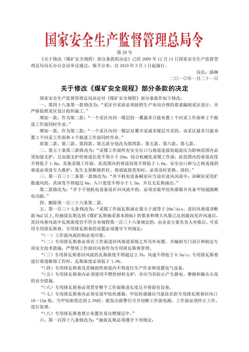安监总局令[2010]第29号_关于修改〈煤矿安全规程〉部分条款的决定