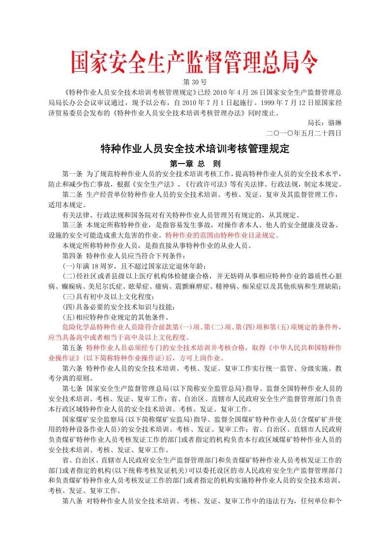 安监总局令[2010]第30号_特种作业人员安全技术培训考核管理规定(安监总局令[2013]第63号修改)