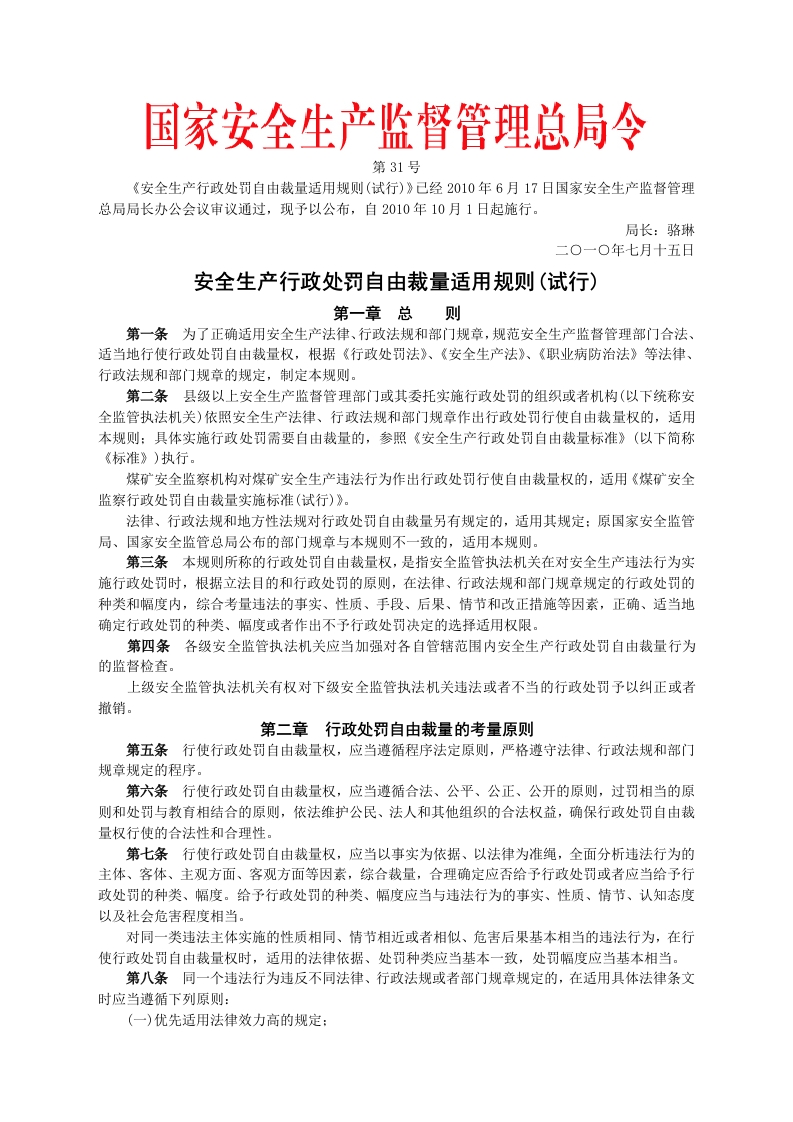 安监总局令[2010]第31号_安全生产行政处罚自由裁量适用规则(试行)