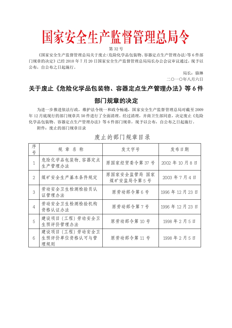安监总局令[2010]第32号_关于废止6件部门规章的决定