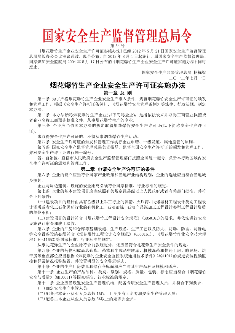 安监总局令[2012]第54号_烟花爆竹生产企业安全生产许可证实施办法