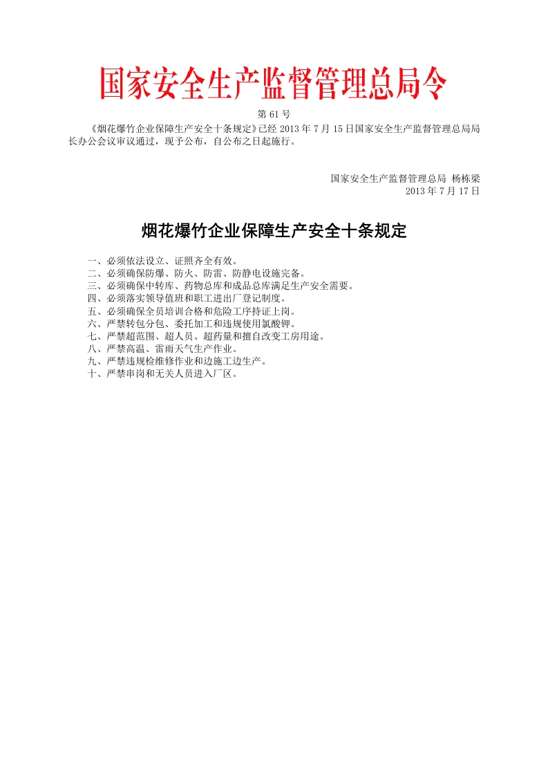 安监总局令[2013]第61号_烟花爆竹企业保障生产安全十条规定