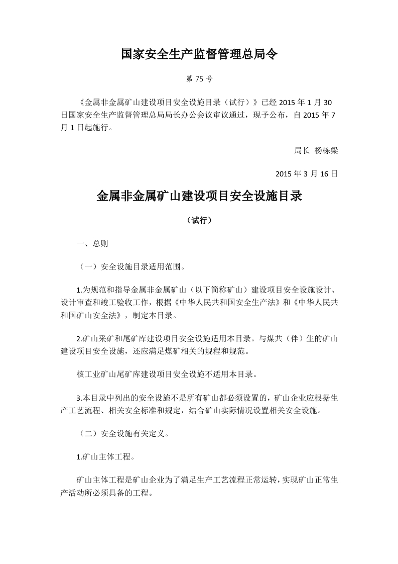 国家安监总局令[2015]第75号_《金属非金属矿山建设项目安全设施目录(试行)》