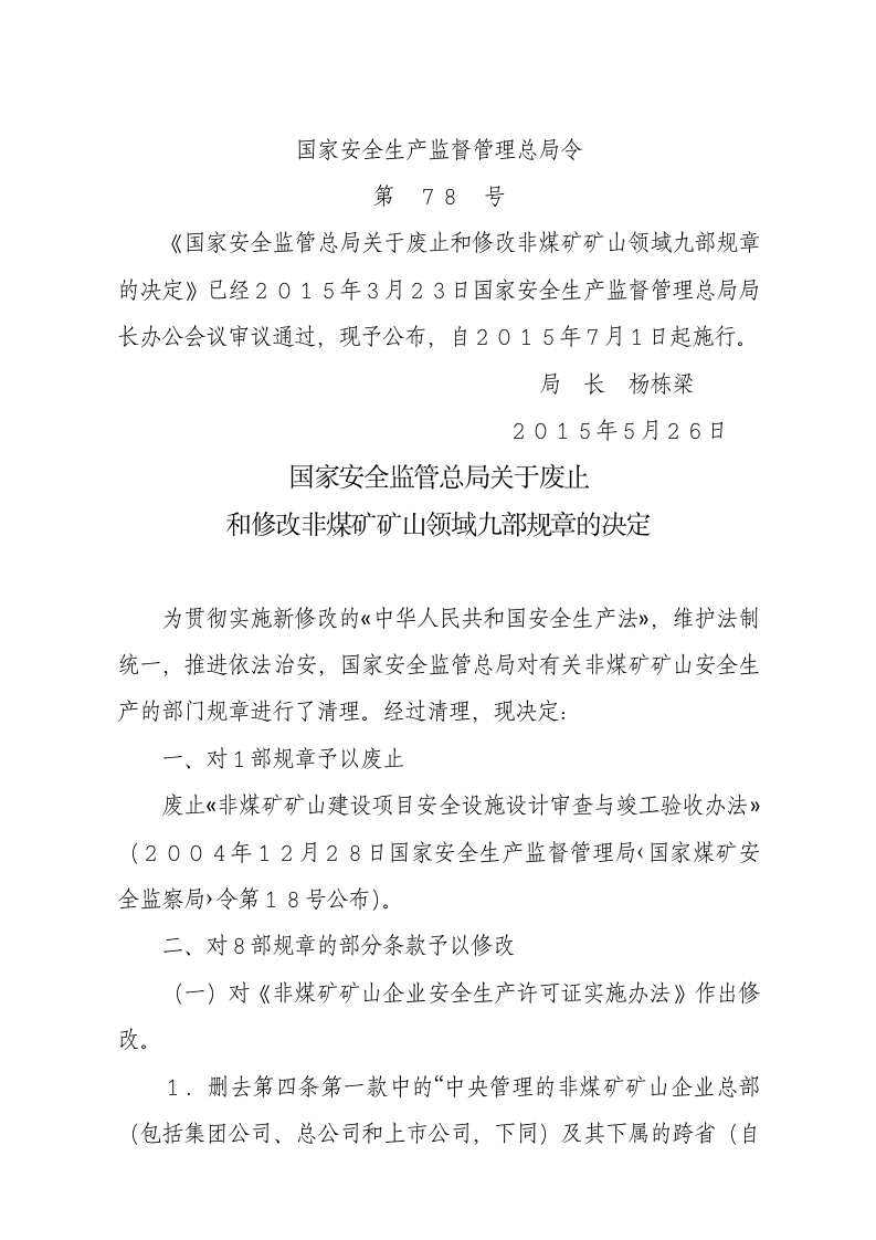 国家安监总局令[2015]第78号_《关于废止和修改煤矿非矿山领域九部规章的决定》