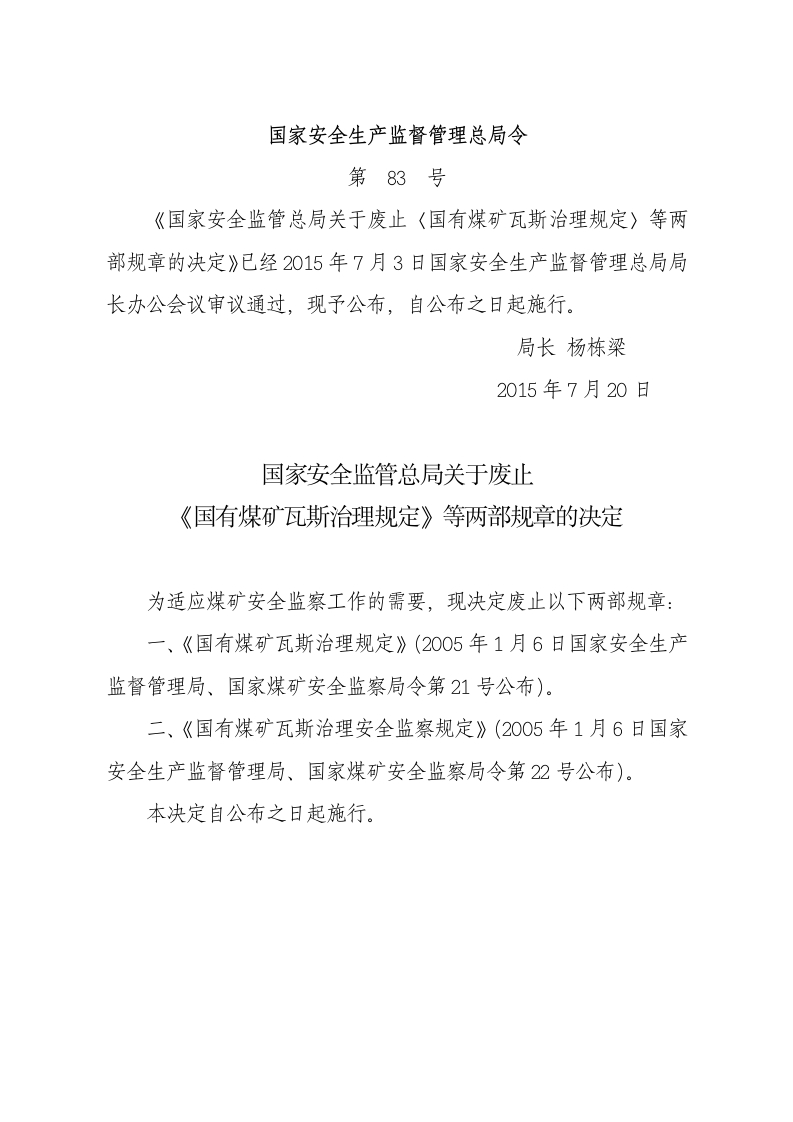 国家安监总局令[2015]第83号_《关于废止国有煤矿瓦斯治理规定等两部规章的决定》