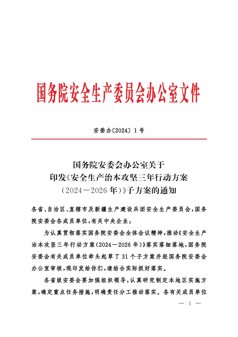国务院安委办印发《安全生产治本攻坚三年行动方案》(31个子方案)的通知