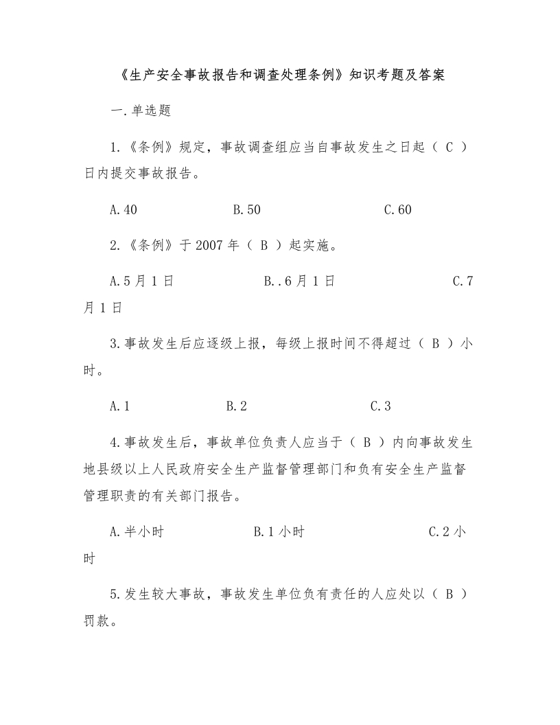 《生产安全事故报告和调查处理条例》知识考题及答案