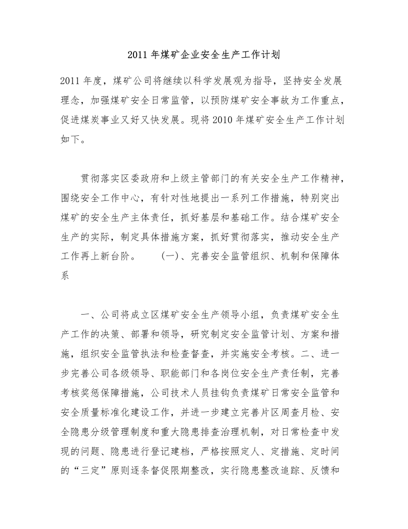 首页安全文档计划2011年煤矿企业安全生产工作计划