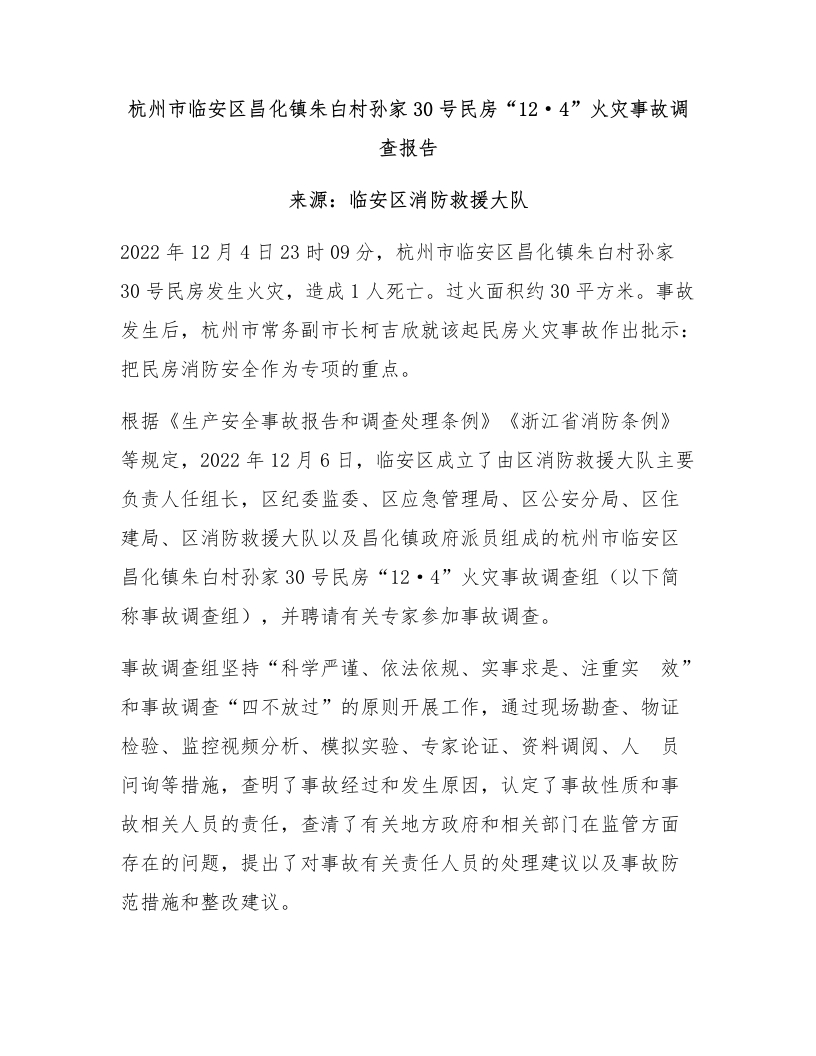 杭州市临安区昌化镇朱白村孙家30号民房“12·4”火灾事故调查报告