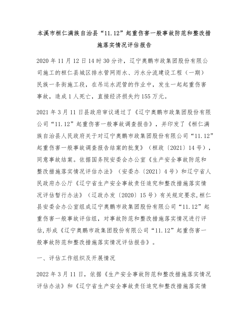 本溪市桓仁满族自治县“11.12”起重伤害一般事故防范和整改措施落实情况评估报告