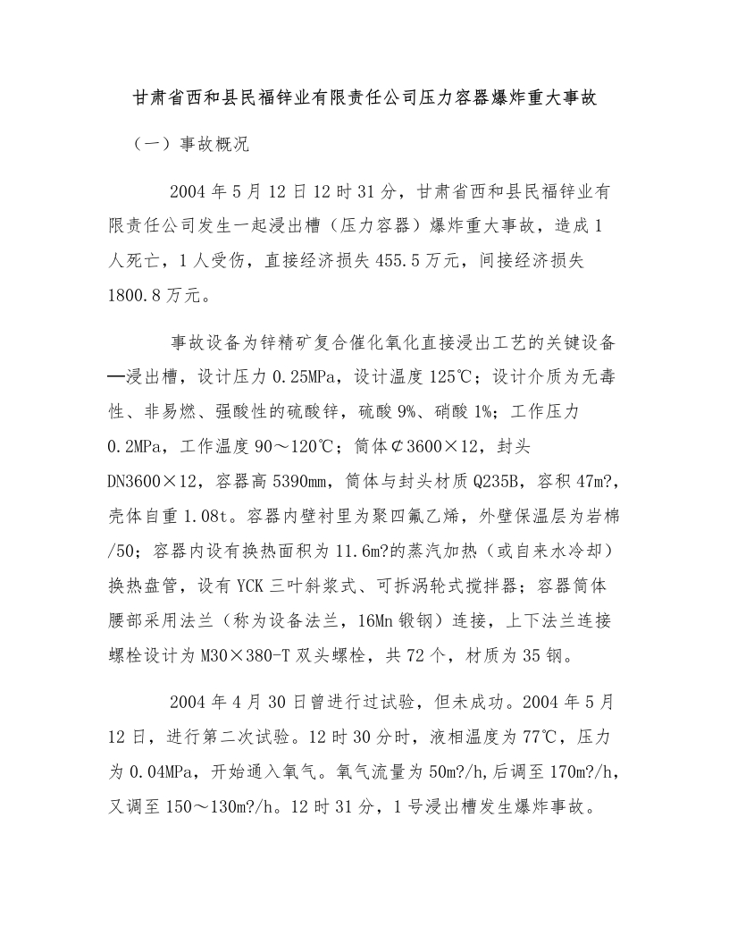 甘肃省西和县民福锌业有限责任公司压力容器爆炸重大事故