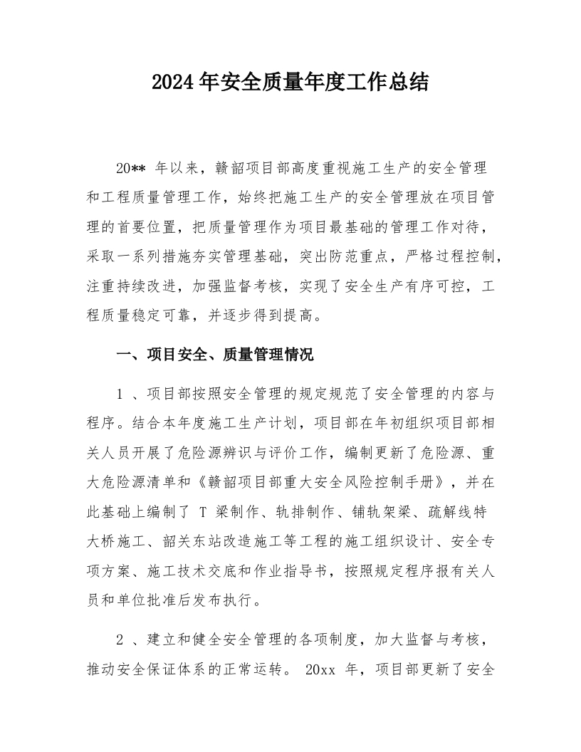 首页安全文档总结【总结】2024年安全质量年度工作总结