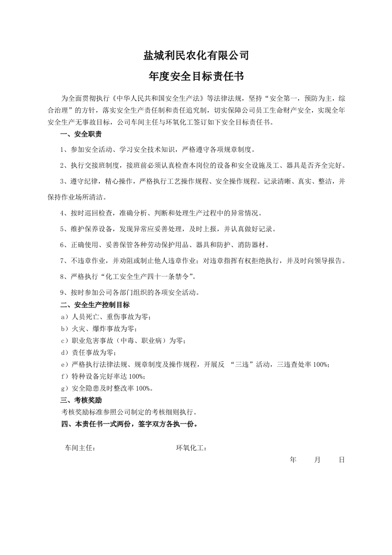 安全目标责任书(环氧化工)