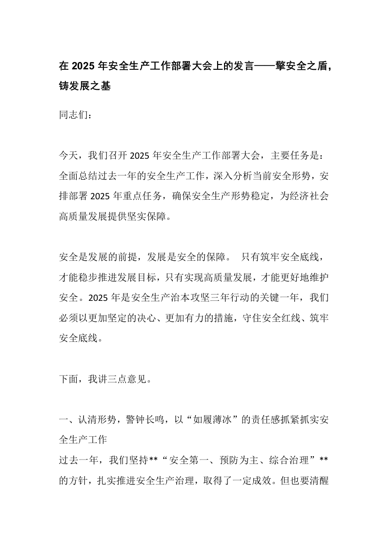 在2025年安全生产工作部署大会上的发言——擎安全之盾,铸发展之基