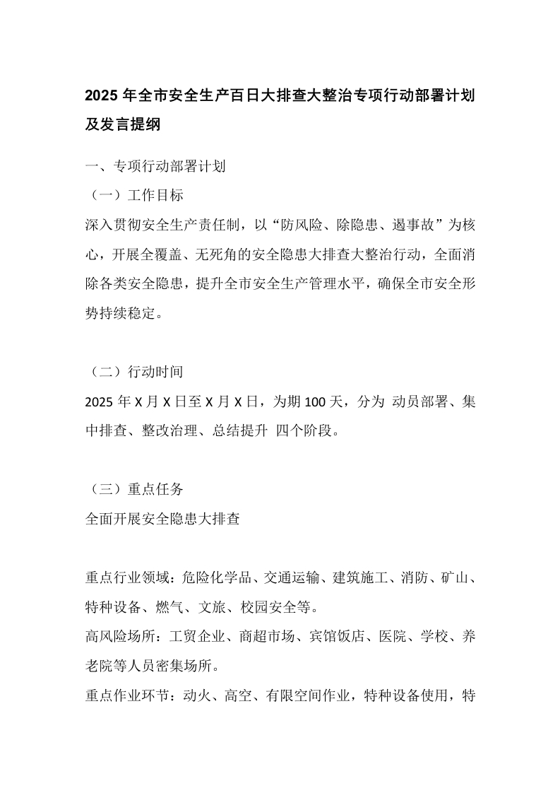2025年全市安全生产百日大排查大整治专项行动部署计划及发言提纲
