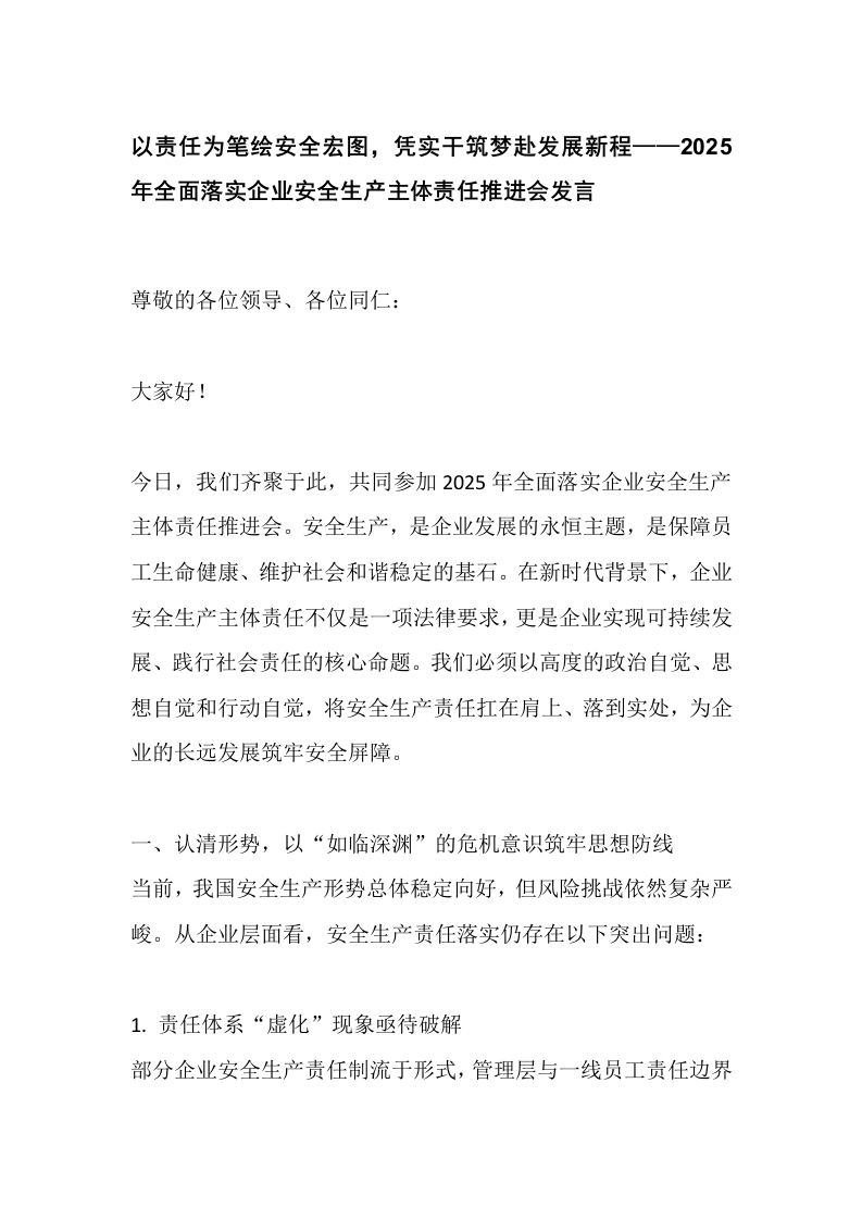 以责任为笔绘安全宏图,凭实干筑梦赴发展新程——2025年全面落实企业安全生产主体责任推进会发言