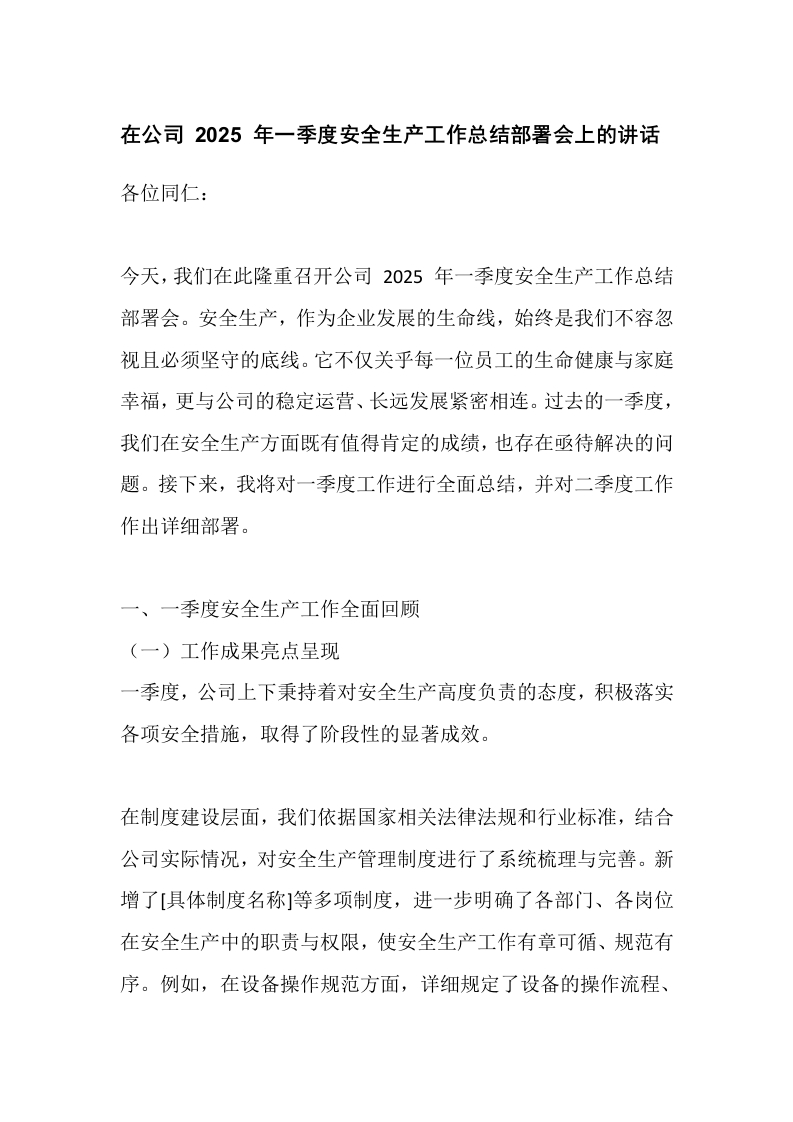在公司 2025 年一季度安全生产工作总结部署会上的讲话