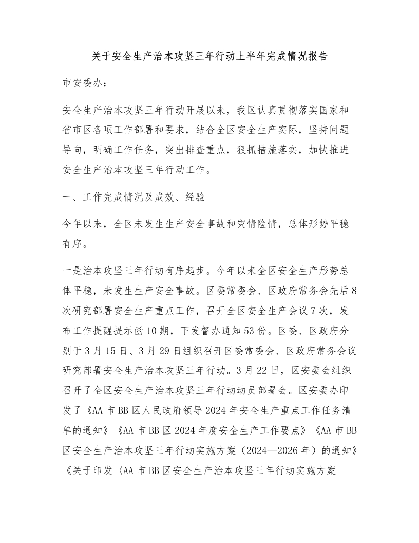 关于安全生产治本攻坚三年行动上半年完成情况报告