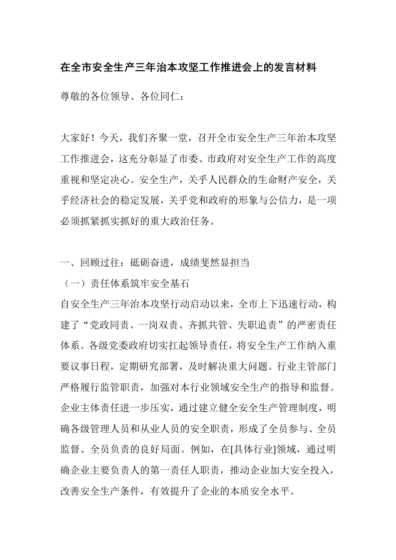 在全市安全生产三年治本攻坚工作推进会上的发言材料