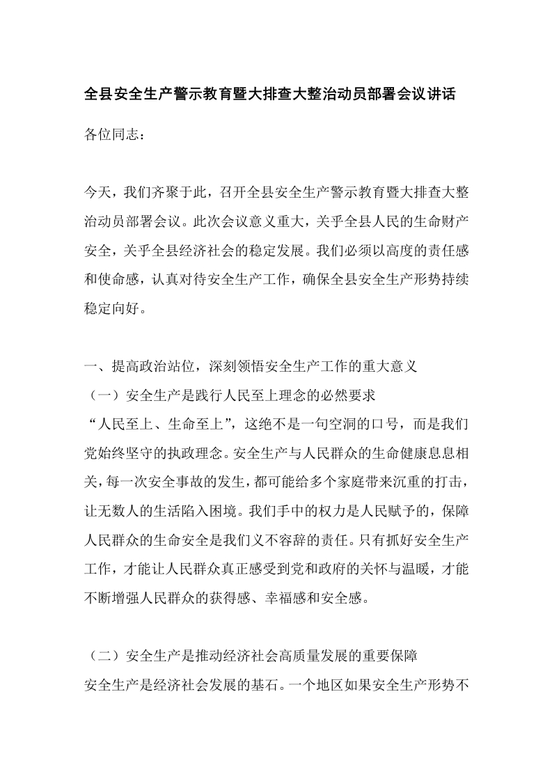 全县安全生产警示教育暨大排查大整治动员部署会议讲话