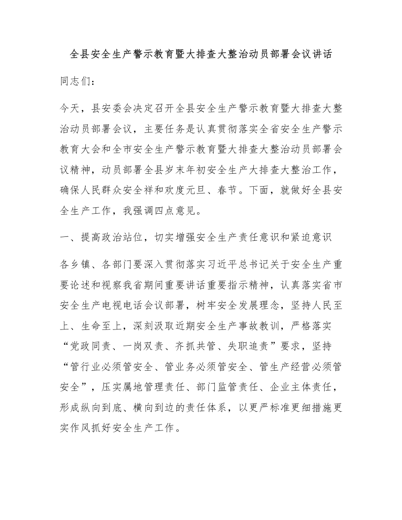 全县安全生产警示教育暨大排查大整治动员部署会议讲话