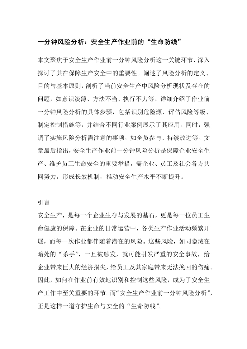 首页安全文档综合一分钟风险分析:安全生产作业前的“生命防线”