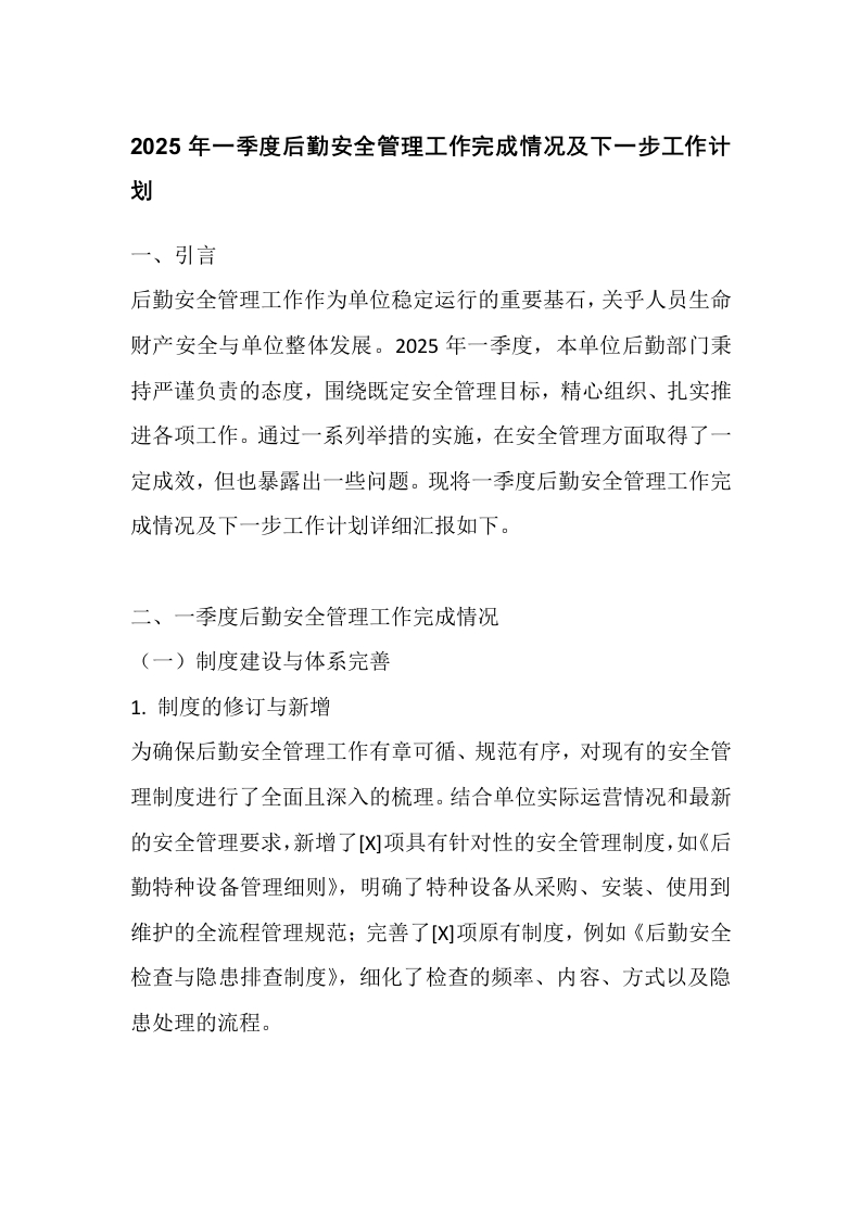 2025年一季度后勤安全管理工作完成情况及下一步工作计划
