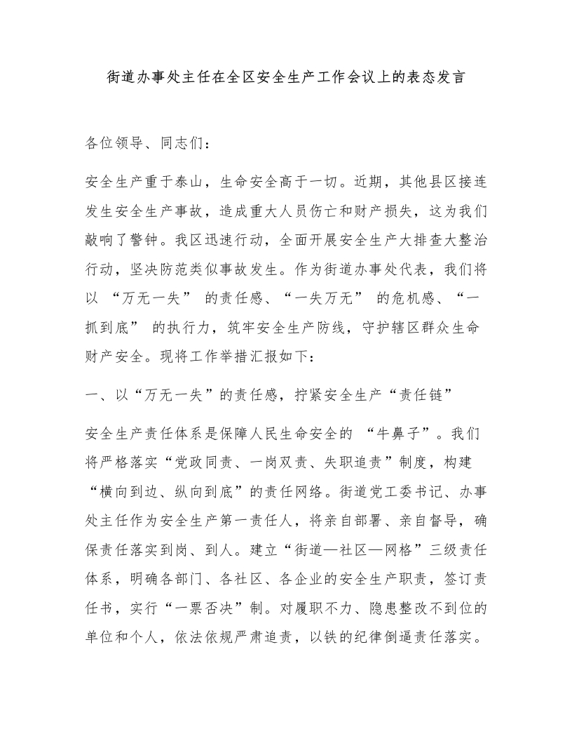 街道办事处主任在全区安全生产工作会议上的表态发言