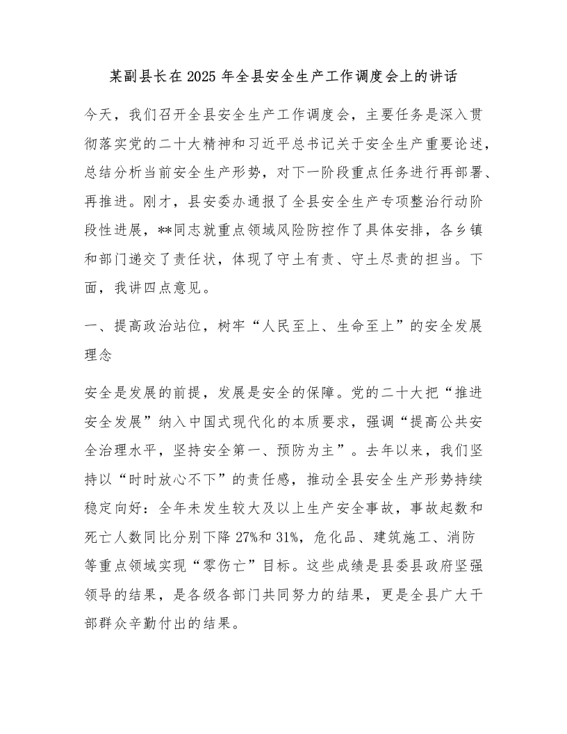 某副县长在2025年全县安全生产工作调度会上的讲话