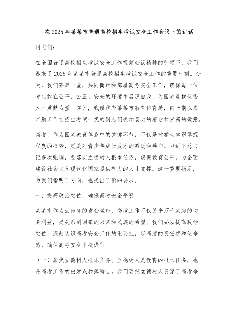 在2025年某某市普通高校招生考试安全工作会议上的讲话