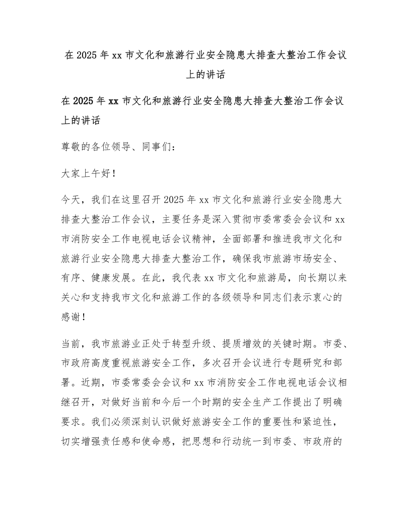 在2025年市文化和旅游行业安全隐患大排查大整治工作会议上的讲话