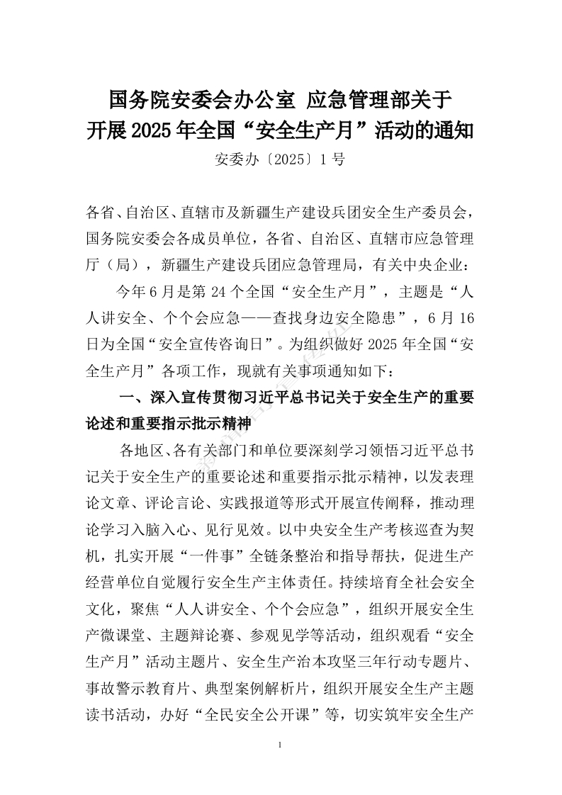 【通知】国务院安委会办公室应急管理部关于开展2025年全国“安全生产月”活动的通知