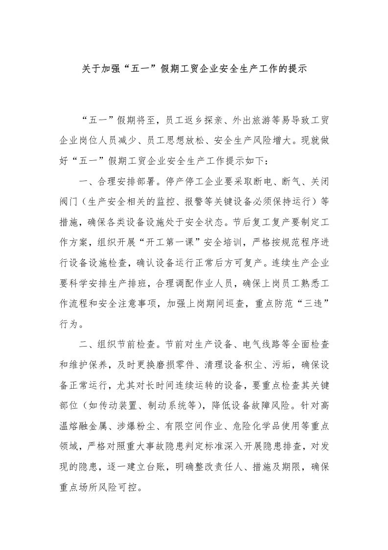 关于加强“五一”假期工贸企业安全生产工作的提示