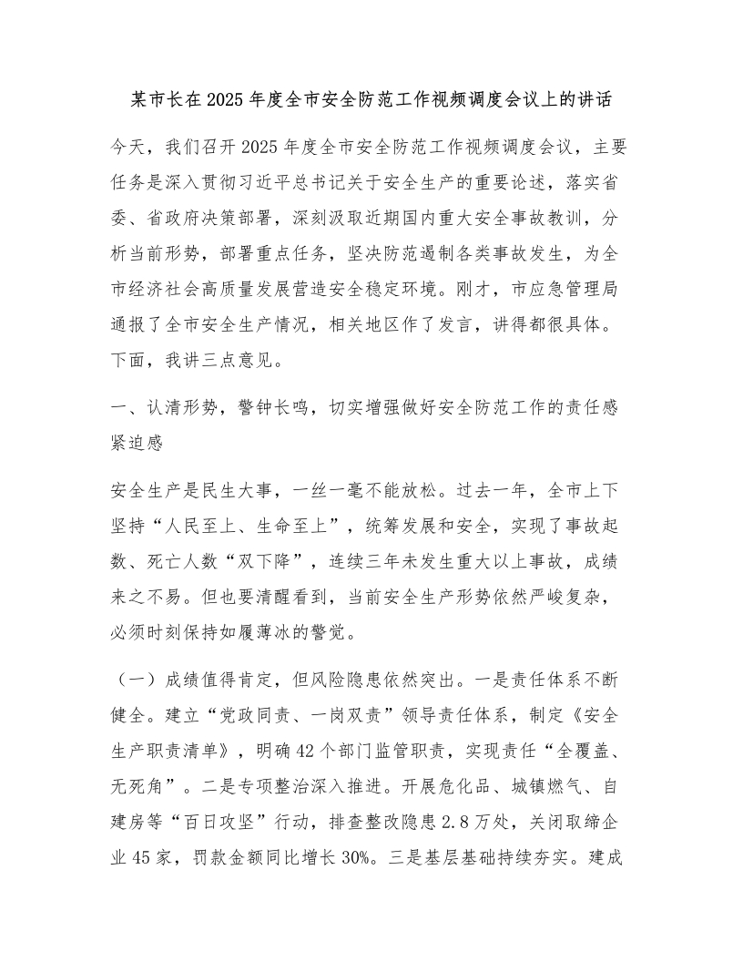某市长在2025年度全市安全防范工作视频调度会议上的讲话