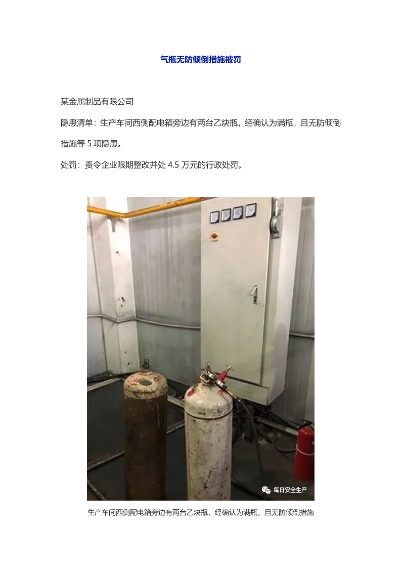 通报:气瓶无防倾倒措施被罚4.5万!