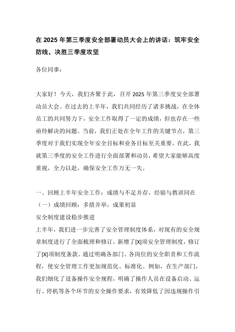 在2025年第三季度安全部署动员大会上的讲话