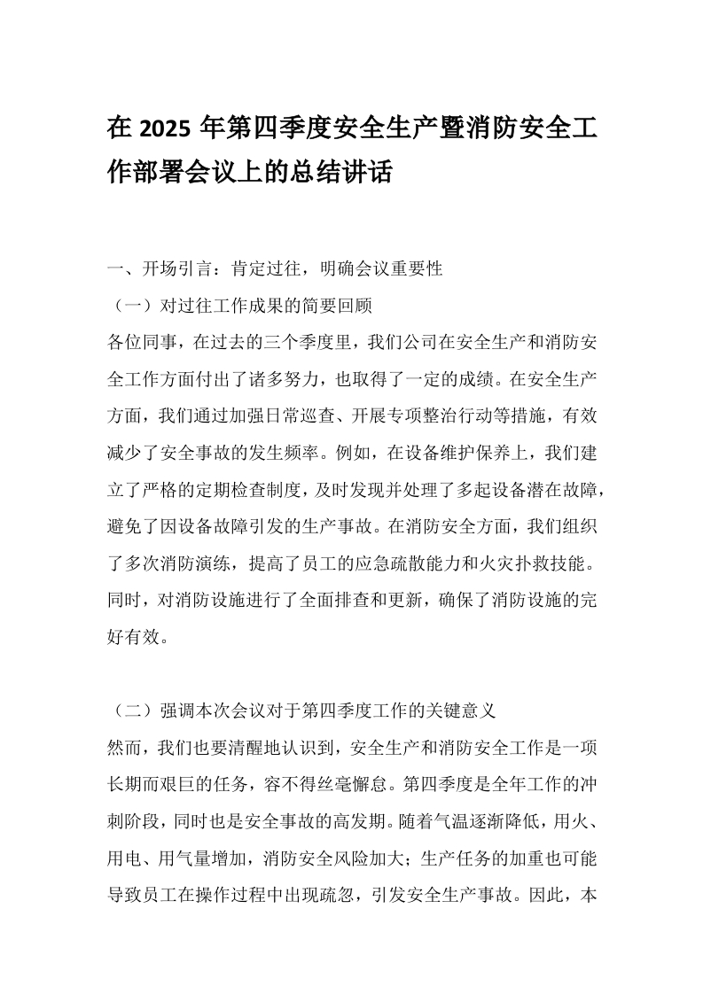 在2025年第四季度安全生产暨消防安全工作部署会议上的总结讲话