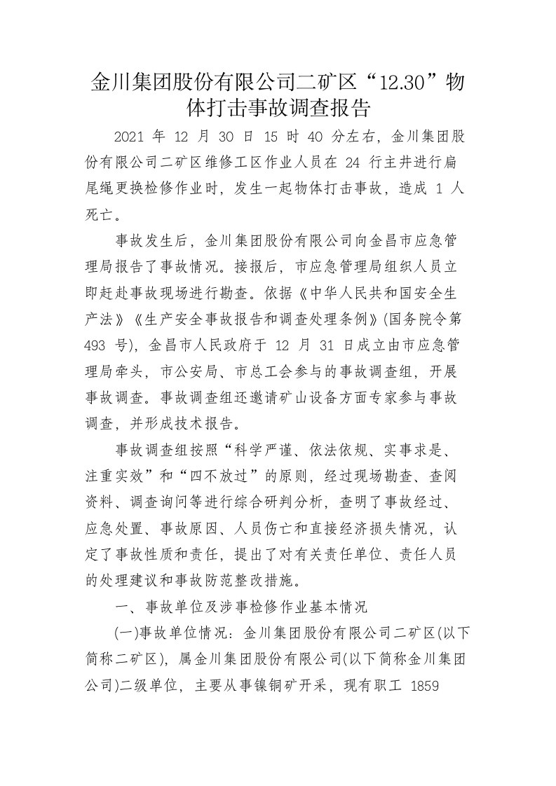 金川集团股份有限公司二矿区12.30物体打击事故调查报告