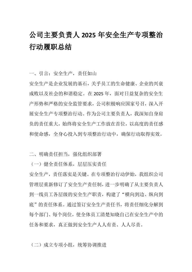公司主要负责人2025年安全生产专项整治行动履职总结