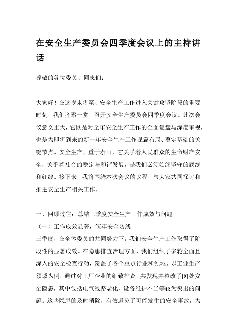 在安全生产委员会四季度会议上的主持讲话