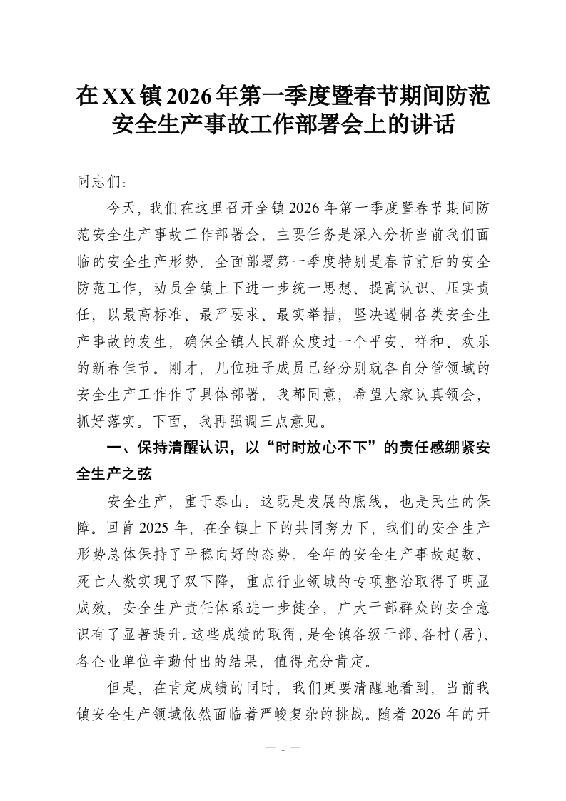 在XX镇2026年第一季度暨春节期间防范安全生产事故工作部署会上的讲话