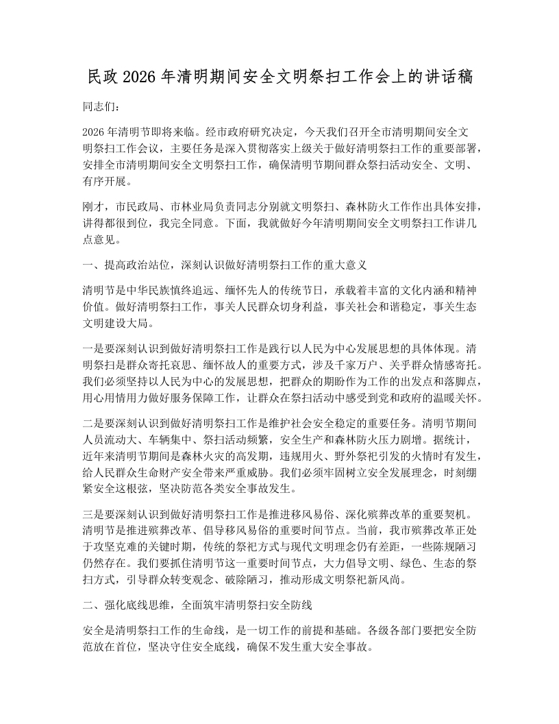 民政2026年清明期间安全文明祭扫工作会上的讲话稿